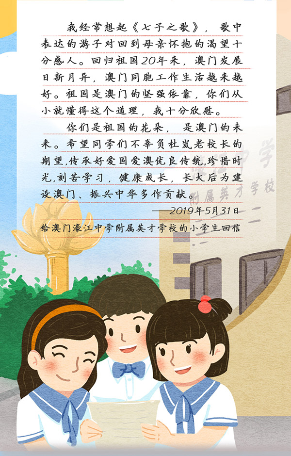 编者按:5月31日,国家主席习近平给澳门濠江中学附属英才学校的小学生回信,对他们予以亲切勉励,并祝他们和全国的少年儿童节日快乐。