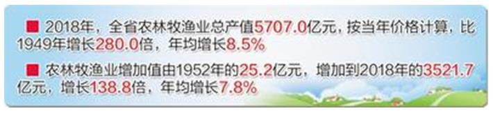 来自省统计局的数据显示,2018年,全省农林牧渔业总产值5707.0亿元,按当年价格计算,比1949年增长280.0倍,年均增长8.5%。农林牧渔业增加值由1952年的25.2亿元,增加到2018年的3521.7亿元,增长138.8倍,年均增长7.8%。