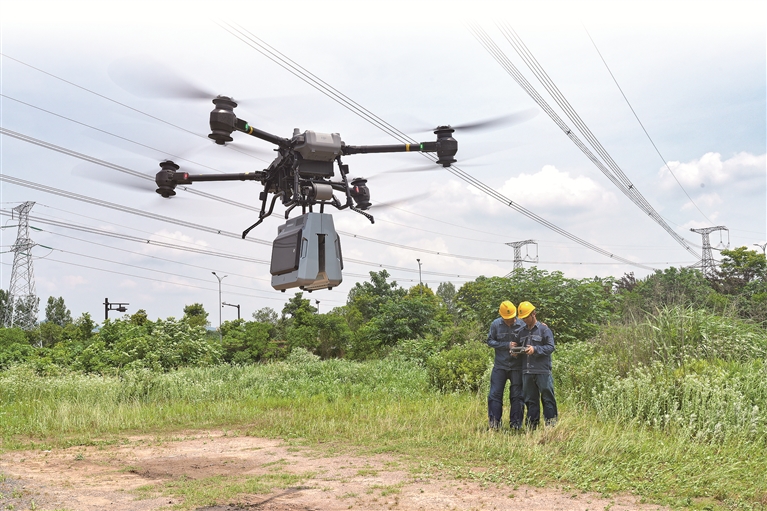 近年来,巡检机器人、修补机器人、水下机器人在电网运维中得到应用。图为国网绍兴供电公司工作人员操作搭载了地线断股带电修补机器人的无人机,对线路进行修复。新华社发