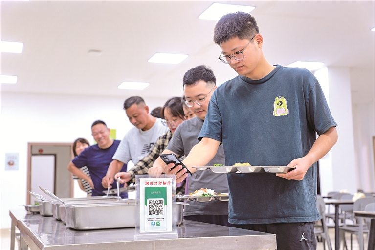 9月25日,在浙江省永康市方岩镇人民政府食堂,下乡走访的干部正通过扫码支付“公务餐”费用。 王晖 摄