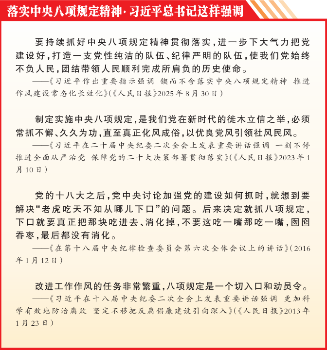 没有规矩,不成方圆。9月25日,中央纪委国家监委公布了2025年8月全国查处违反中央八项规定精神问题汇总情况。当月,全国共查处违反中央八项规定精神问题26838起,批评教育和处理34480人,其中党纪政务处分23547人,这是连续第144个月公布月报数据,传递出纪检监察机关常态长效深化落实中央八项规定及其实施细则精神、一严到底纠治“四风”的强烈信号。纪检监察机关要自觉把思想和行动统一到党中央决策部署上来,紧紧围绕二十届中央纪委四次全会部署,坚持以“永远在路上”的执着和“抓铁有痕”的韧劲,不断加固中央八项规定堤坝。