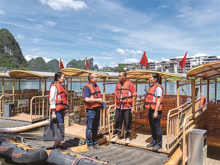 广西壮族自治区阳朔县纪委监委把履行生态环保责任作为政治监督的重点,加强对漓江沿岸生态环境保护的监督检查,坚决整治生态环境保护主体责任不落实、制度执行不到位、问题整改不彻底等问题,以有力监督筑牢漓江生态屏障。图为9月26日,该县纪检监察干部在漓江沿岸走访了解有关情况。夏立慧 摄