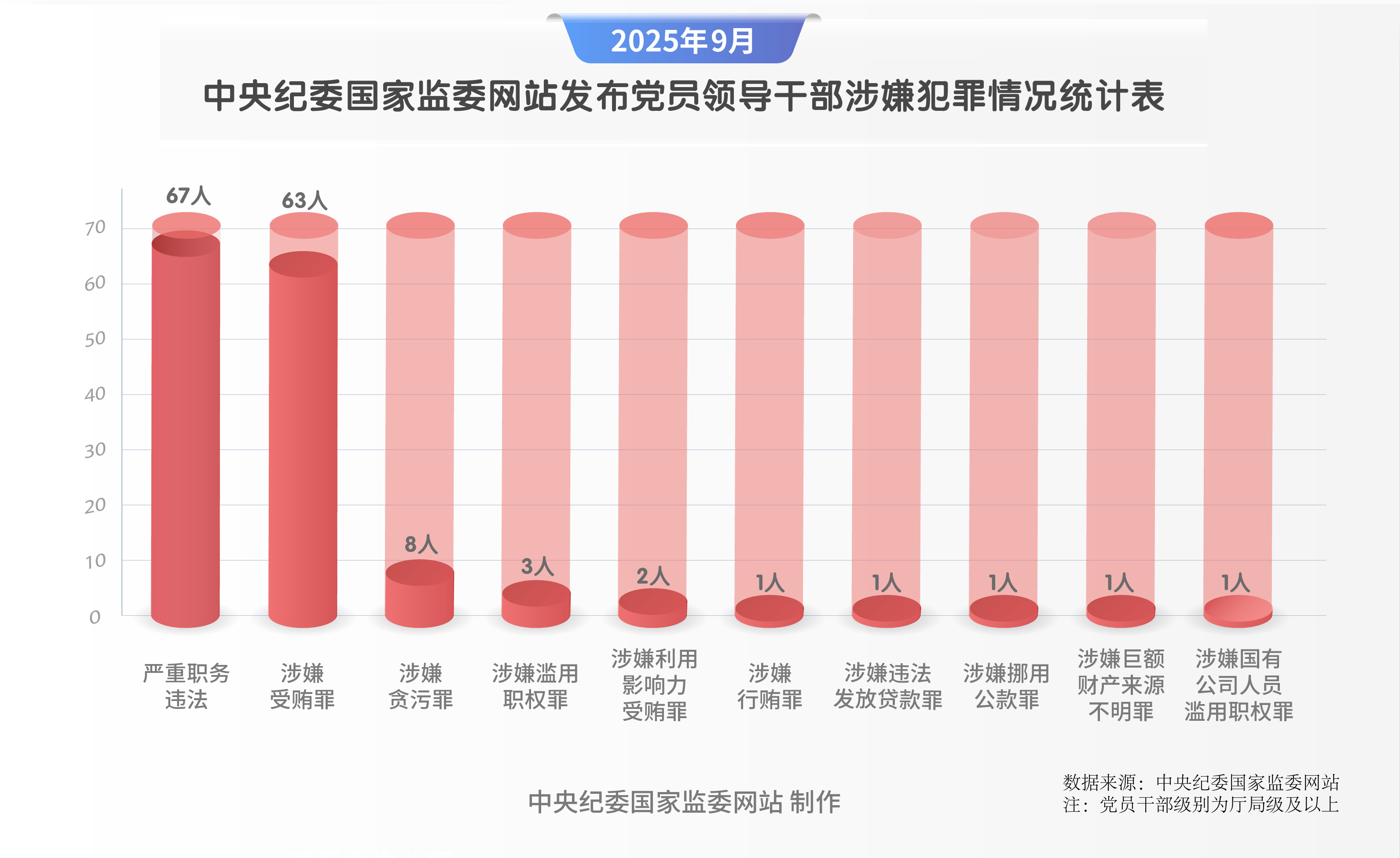 2025年9月,中央纪委国家监委网站发布的党纪政务处分信息中,67名被处分党员、干部均构成严重职务违法,63人被指涉嫌受贿犯罪,8人被指涉嫌贪污犯罪,3人被指涉嫌滥用职权犯罪,2人被指涉嫌利用影响力受贿犯罪,另外各有1人被指涉嫌行贿罪、违法发放贷款罪、挪用公款罪、巨额财产来源不明罪、国有公司人员滥用职权罪。