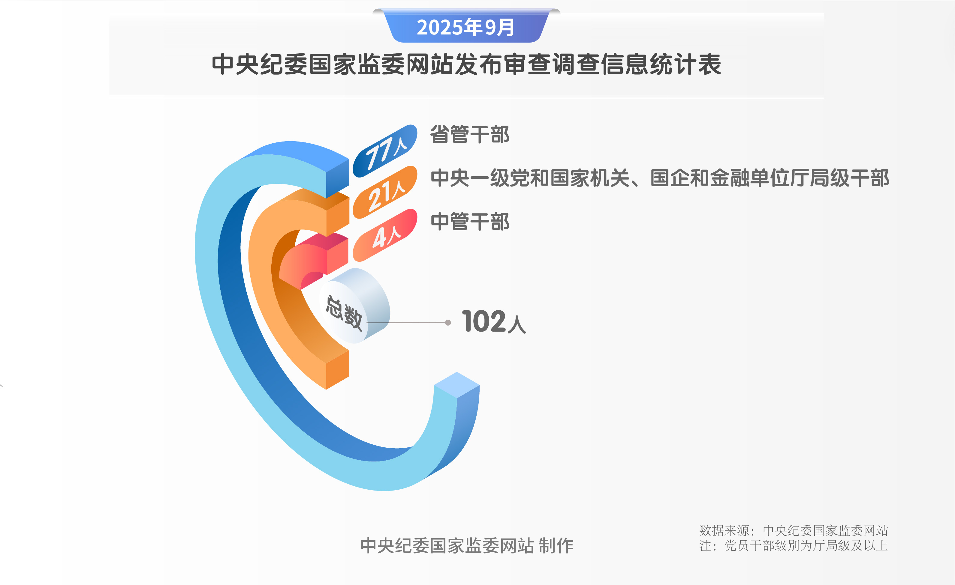 2025年9月,中央纪委国家监委网站共发布102名党员、干部接受审查调查信息。其中,中管干部4名,中央一级党和国家机关、国企和金融单位厅局级干部21名,省管干部77名。