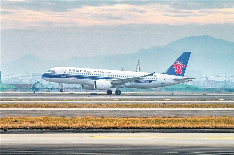 图为一架南航C919国产大飞机在广州白云国际机场起飞。 新华社记者 王瑞平 摄