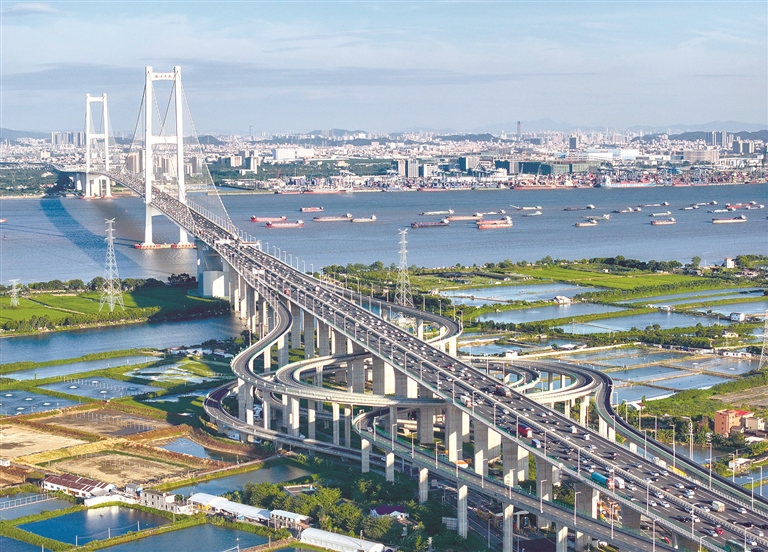 图为广东南沙大桥上的车流和狮子洋水道的船舶来来往往。 新华社记者 刘大伟 摄