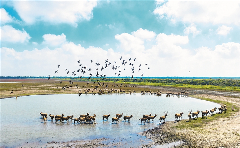 党的二十届四中全会引发多国人士和国际舆论广泛关注与热烈讨论。“‘十五五’规划”“高质量发展”“绿色创新”……这些全球媒体和学者热议的关键词,展现了世界对于共享中国发展新机遇的热切期待。 近日,在江苏东台条子泥湿地,候鸟飞翔,成群野生麋鹿悠闲散步。新华社发(孙家录 摄)
