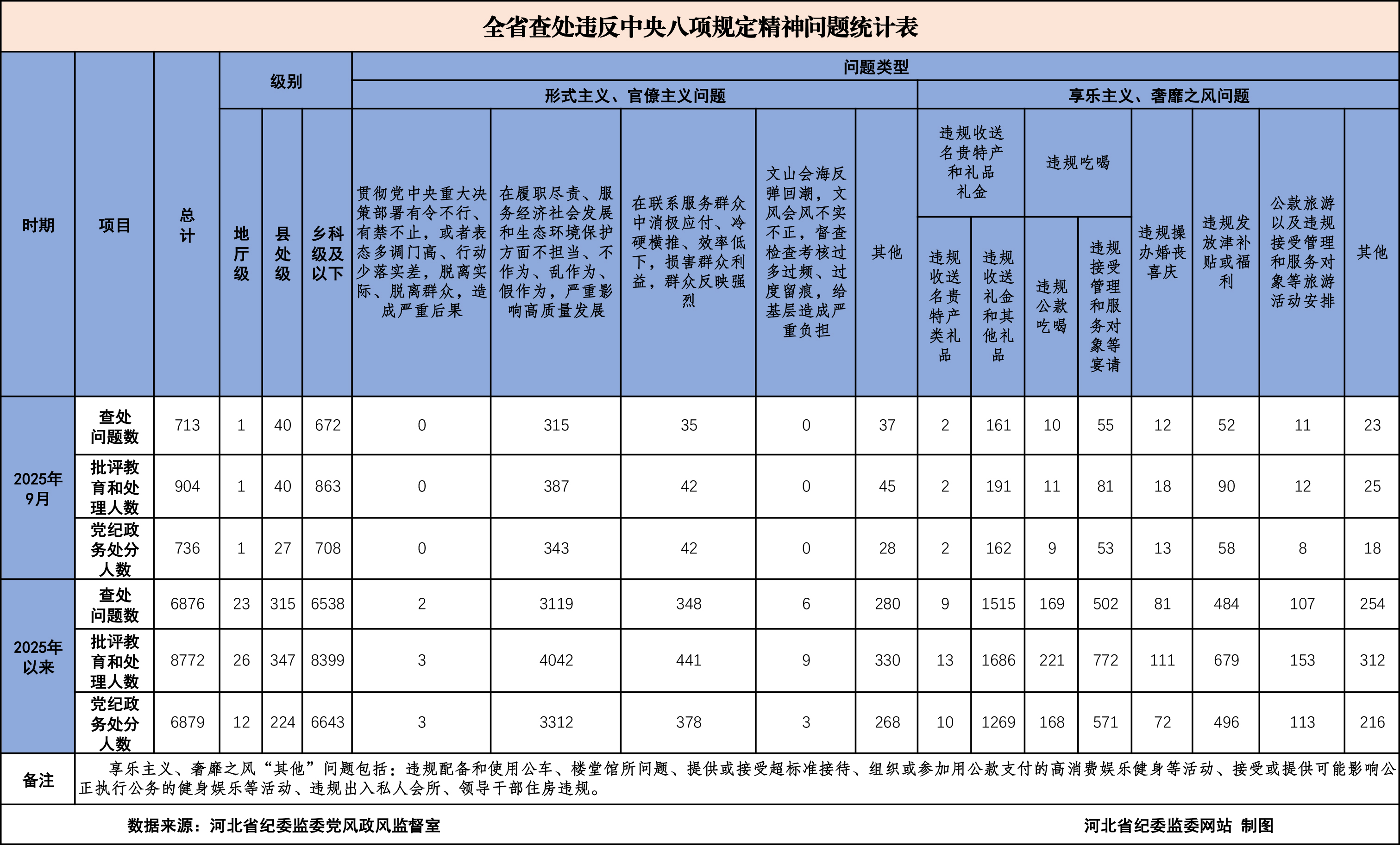今年9月,全省共查处违反中央八项规定精神问题713起,批评教育和处理904人,其中党纪政务处分736人。