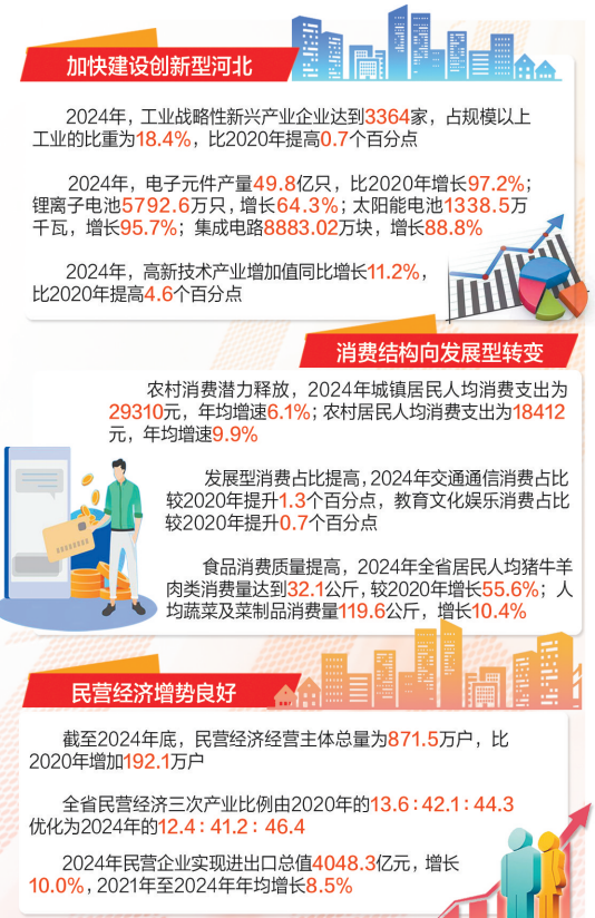 2024年,国家级专精特新“小巨人”企业达到409家,比2020年增长2.8倍;截至2024年底,民营经济经营主体总量为871.5万户,比2020年增加192.1万户;2024年,全省社会物流总额为9.3万亿元,物流业总费用与地区生产总值的比率为14.0%,为历年来最低水平……这张“十四五”沉甸甸的成绩单,彰显了河北高质量发展成色。
