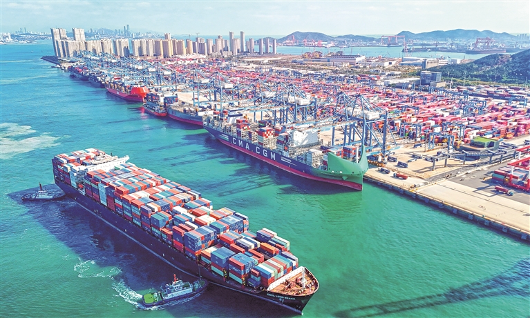 自由贸易试验区,是新时代中国改革开放的“试验田”,发挥着先行先试的优势和示范引领的作用。图为近日,作为新亚欧大陆桥经济走廊与海上合作战略双节点的中国(山东)自由贸易试验区青岛片区繁忙景象(无人机照片)。该自贸区首创“保税+出口转关”集拼模式使国际中转集拼效率较釜山、新加坡等港口缩短3至5个工作日,为畅通国内国际双循环提供了坚实的物流支撑。新华社发(张进刚 摄)