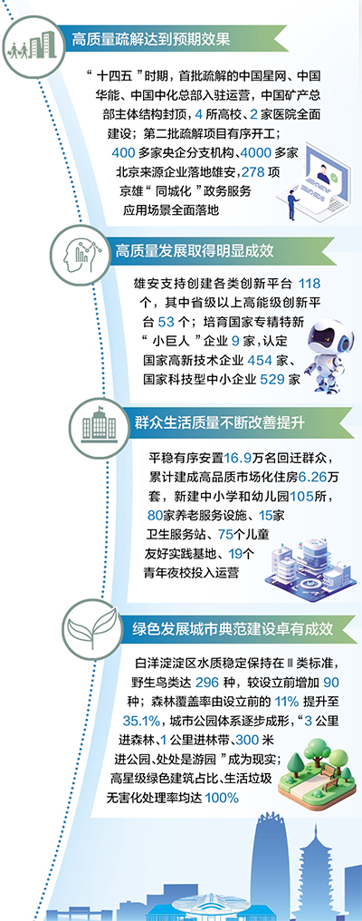“高质量疏解达到预期效果,雄安正在成为高等教育和人才密集区、高端医疗密集区、央企机构和创新业务板块集聚区。”雄安新区党工委副书记、管委会常务副主任吴波说。