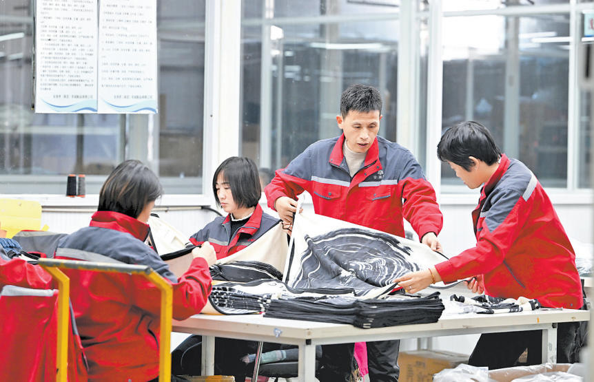 11月14日,安美桥(南宫)羊绒制品有限公司首席质量官赵建军(右二)在检查羊绒围巾质量。本报记者 赵永辉摄