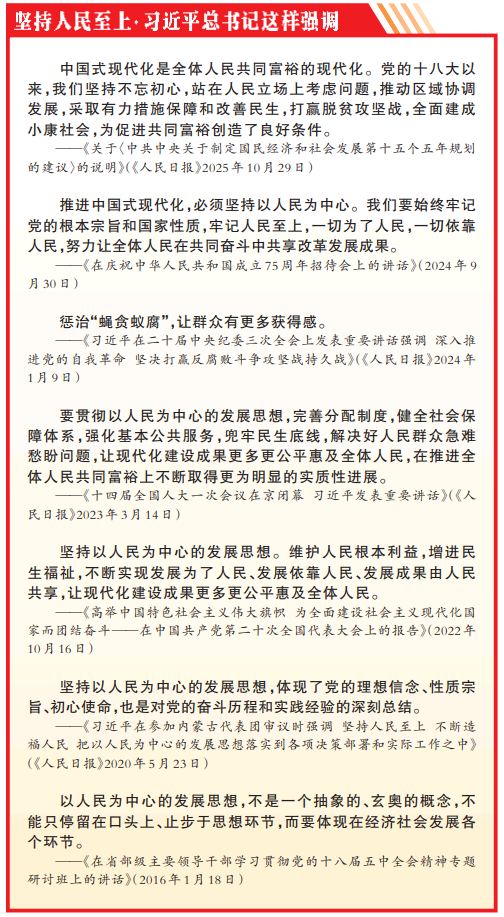 党的十九届六中全会通过的《中共中央关于党的百年奋斗重大成就和历史经验的决议》,明确“坚持人民至上”是中国共产党百年奋斗的十条历史经验之一,强调“始终牢记江山就是人民、人民就是江山,坚持一切为了人民、一切依靠人民,坚持为人民执政、靠人民执政,坚持发展为了人民、发展依靠人民、发展成果由人民共享,坚定不移走全体人民共同富裕道路”。党的二十大着眼全面建成社会主义现代化强国的宏伟目标和战略安排,鲜明提出了前进道路上必须牢牢把握的五条重大原则,“坚持以人民为中心的发展思想”正是其中之一。党的二十届四中全会明确,“坚持人民至上”是“十五五”时期经济社会发展必须遵循的原则之一。