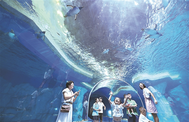 习近平总书记近日在听取海南自由贸易港建设工作汇报时强调,生态是海南一大优势,要守护好这份家底,坚持陆海统筹,持续抓好突出环境问题整治,高质量建设国家生态文明试验区。青山绿水、碧海蓝天是海南最强的优势和最大的本钱,不是光属于海南,是属于全国人民的,是属于地球的。图为近日,游客在海南海洋欢乐世界度假区游玩。新华社记者 郭程 摄