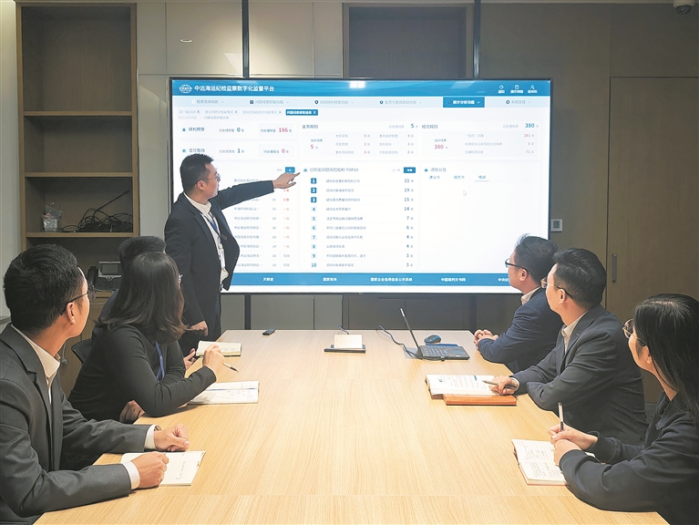 图为近日,中央纪委国家监委驻中国远洋海运纪检监察组干部利用数字化监督平台开展日常监督,对预警风险进行分析研判。 郭熠 摄
