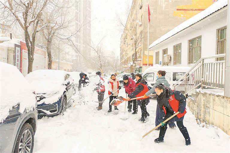 近日,新疆维吾尔自治区乌鲁木齐市天山区幸福路街道职大社区党员志愿者正在清理道路积雪。