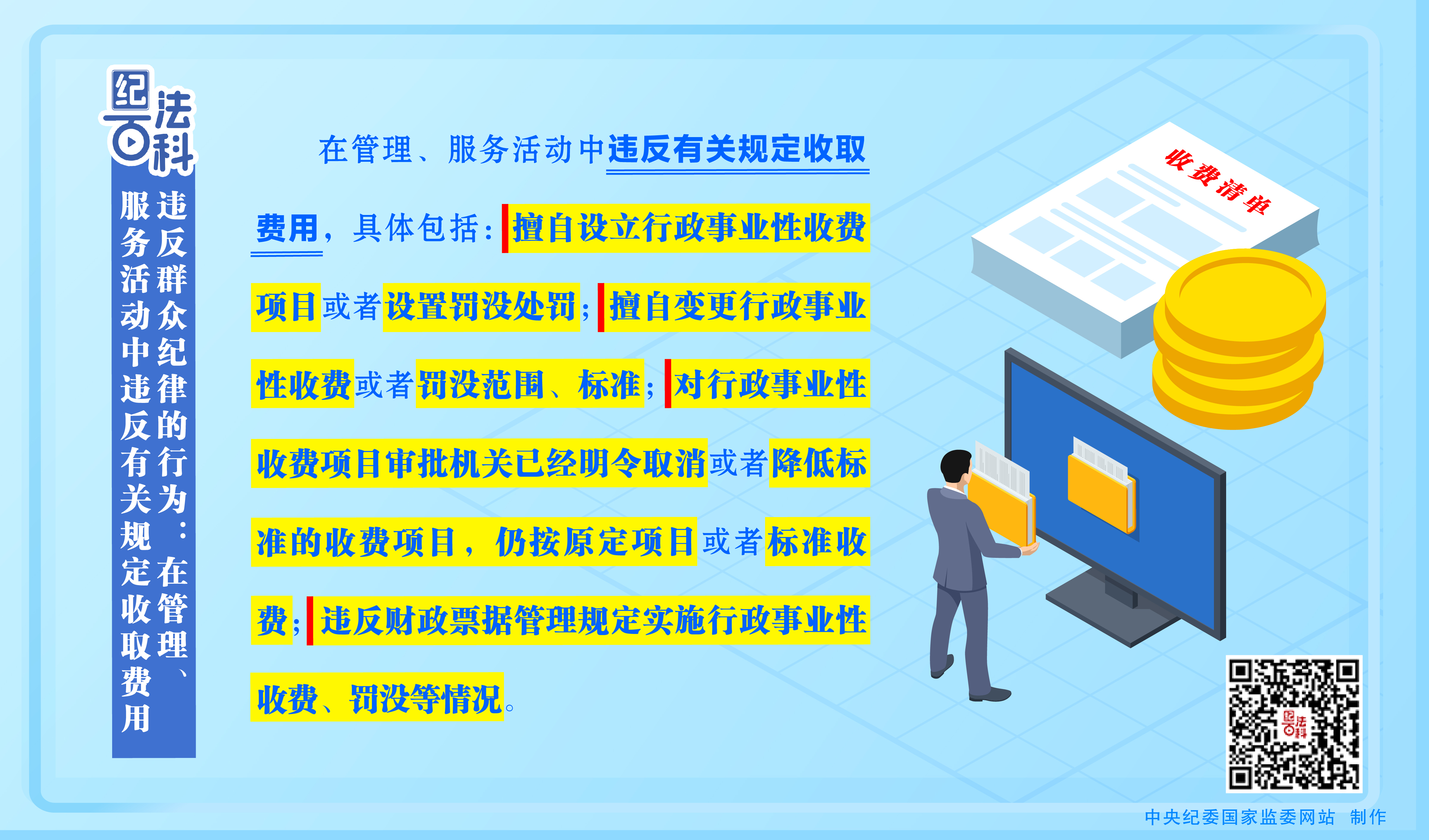 公共管理活动大多是义务的、免费的,具有公益性质。部分需要收取费用的管理、服务活动,在性质上属于行政事业性收费,必须有明确的法律法规依据,应当严格按照权限和程序办理,否则就是乱收费。执纪监督中发现,有的党员、干部借给群众发放惠农物资之机,擅自收取手续费;有的明知国家已经取消相关收费,还违规继续向群众收取费用等。这类行为加重群众负担,引发群众强烈不满,必须坚决杜绝。