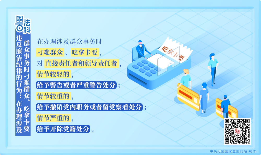 《中国共产党纪律处分条例》第一百二十二条规定,在办理涉及群众事务时刁难群众、吃拿卡要,对直接责任者和领导责任者,情节较轻的,给予警告或者严重警告处分;情节较重的,给予撤销党内职务或者留党察看处分;情节严重的,给予开除党籍处分。
