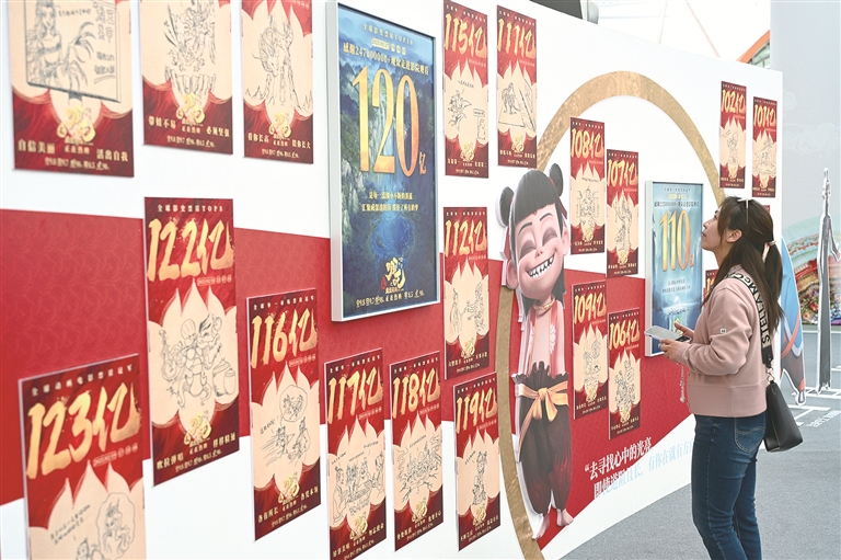 2025年4月19日,观众在电影《哪吒之魔童闹海》破亿手绘海报展参观。新华社记者 李鑫 摄