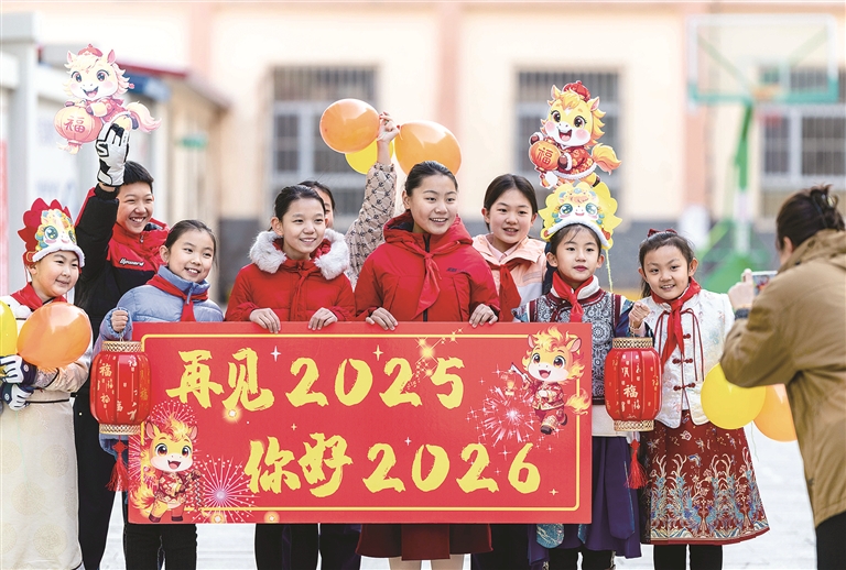 2025年12月30日,内蒙古自治区呼和浩特市玉泉区恒昌店巷小学学生手持“再见2025 你好2026”标语合影。 图片来源:视觉中国