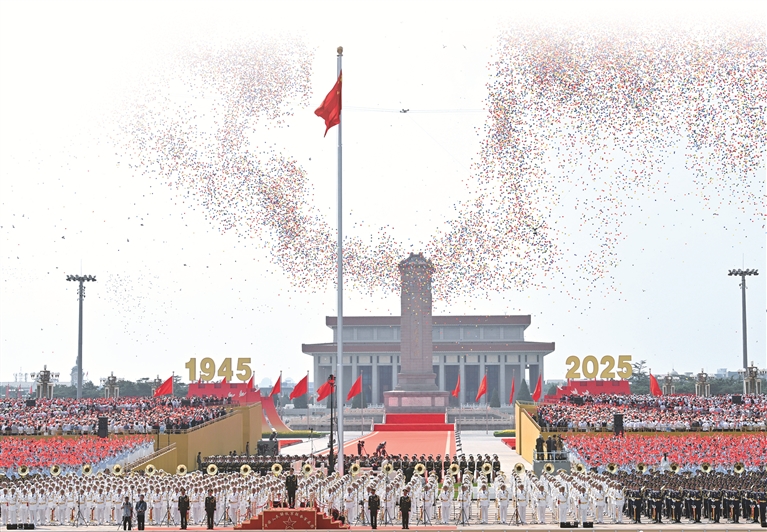 2025年9月3日,纪念中国人民抗日战争暨世界反法西斯战争胜利80周年大会在北京隆重举行。宽阔的长安街向远处延伸,以“复兴”命名的道路平直如砥。受阅官兵如钢铁洪流般浩荡前进,昂首挺胸、步履铿锵,雄姿英发、威震寰宇。胜利的荣光、前行的伟力、未来的希望,汇聚成昂扬的旋律,激荡回响于神州大地。