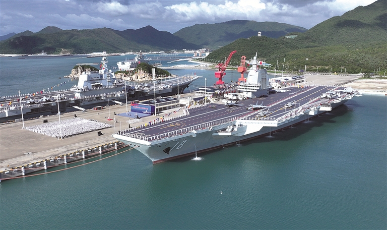 2025年11月5日,我国第一艘电磁弹射型航空母舰福建舰入列授旗仪式在海南三亚某军港举行。 新华社记者 李刚 摄