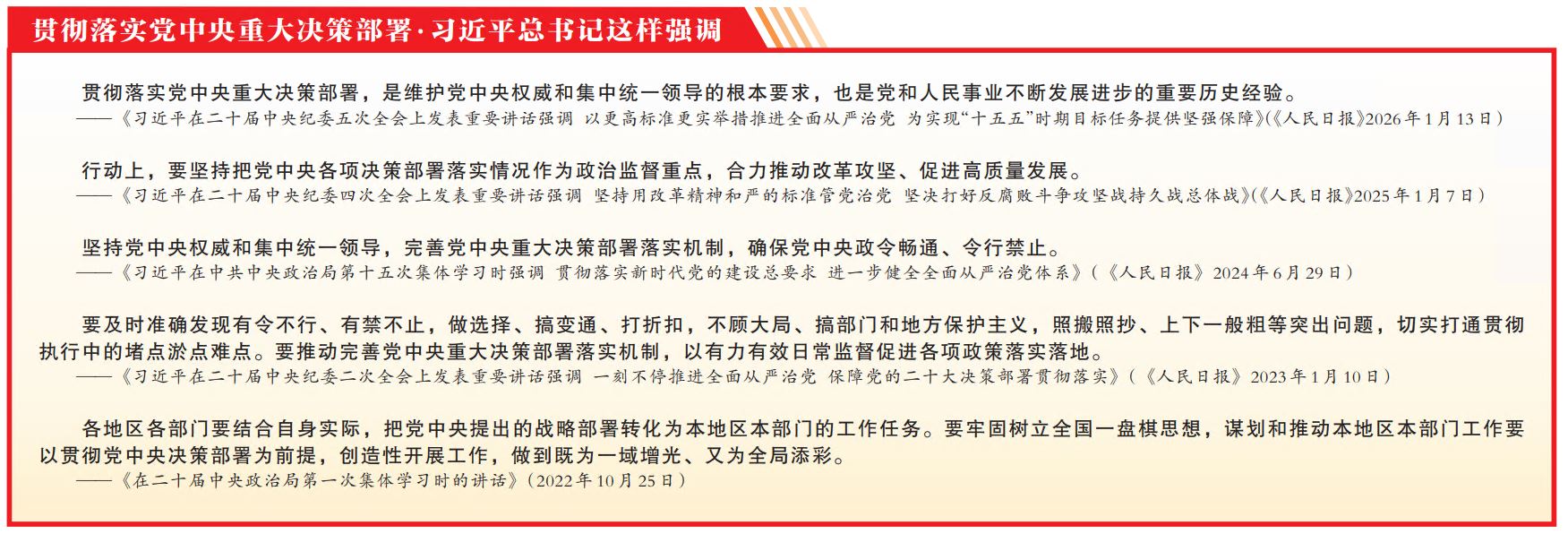 贯彻落实党中央重大决策部署,需要强化制度机制保障。习近平总书记指出,“要完善党中央重大决策部署落实机制,及时发现和解决‘拦路虎’、‘中梗阻’、‘断头路’等问题,确保党中央政令畅通、令行禁止”“健全总揽全局、协调各方的党的领导制度体系,完善党中央重大决策部署落实机制,确保全党在政治立场、政治方向、政治原则、政治道路上同党中央保持高度一致,确保党的团结统一”。“十五五”规划建议强调,完善党中央重大决策部署落实机制,确保上下贯通、执行有力。