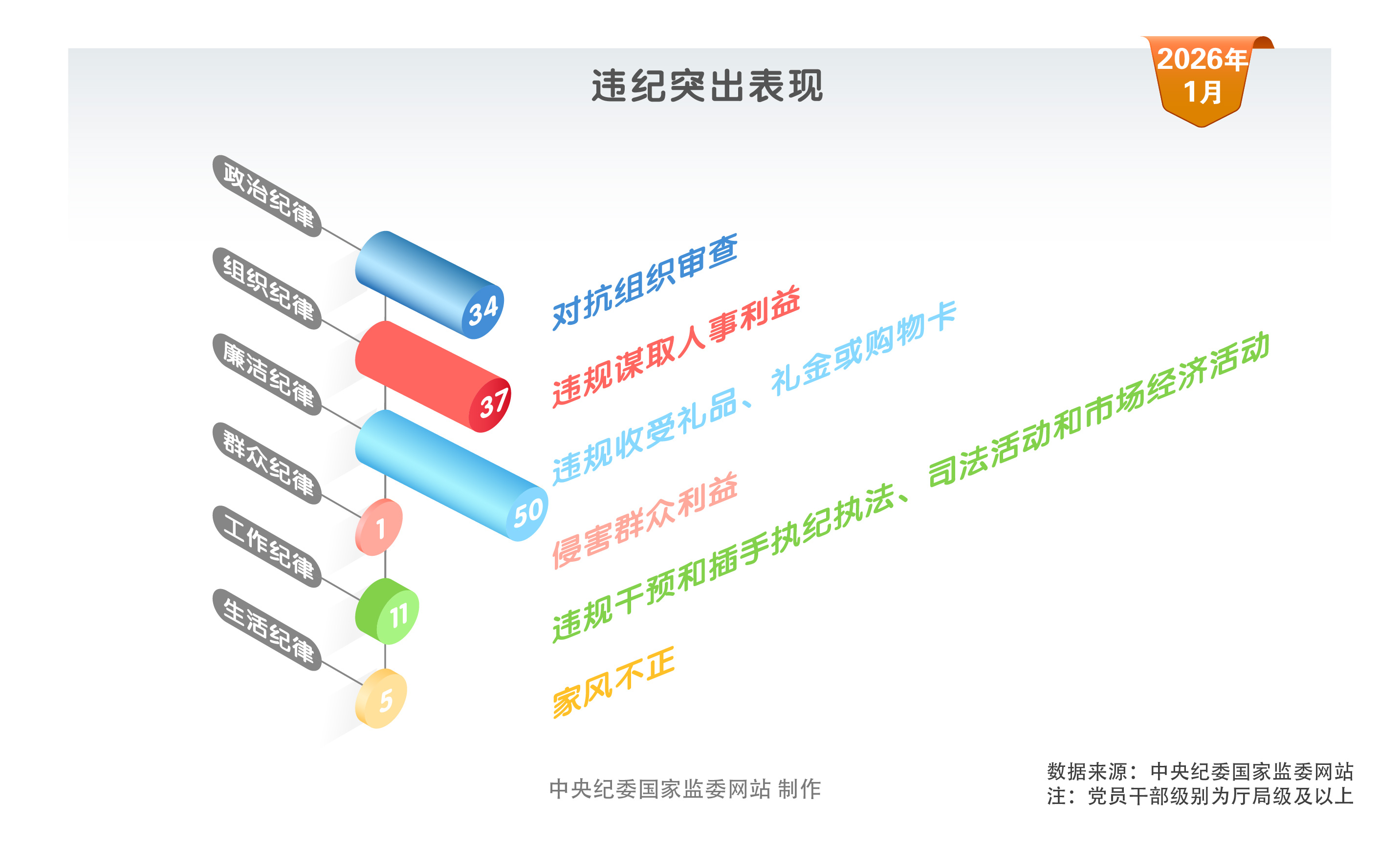 2026年1月,中央纪委国家监委网站发布的52条党纪政务处分信息中,47人违反政治纪律,52人违反中央八项规定精神,48人违反组织纪律,50人违反廉洁纪律,2人违反群众纪律,22人违反工作纪律,23人违反生活纪律。