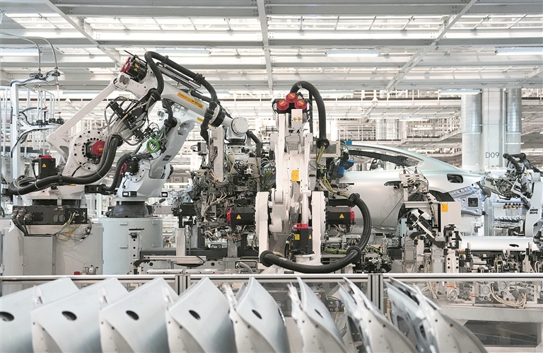 在制造业技术改造升级工程、工业领域设备更新等政策推动下,各地各领域瞄准高端化、智能化、绿色化加快转型,新兴产业、未来产业与日俱新。图为机器人在北京某汽车工厂车间流水线上工作。 新华社记者 郑焕松 摄