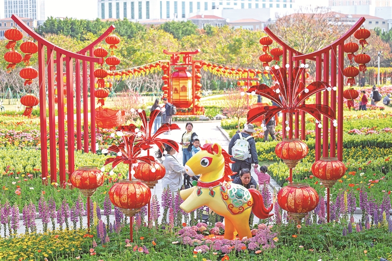 为迎接农历新年到来,澳门市政署在氹仔龙环葡韵举行庆新春主题花展,花展以马年装饰为主题,让市民及游客感受浓厚的新春节日气氛,共度佳节。新华社发 张金加 摄