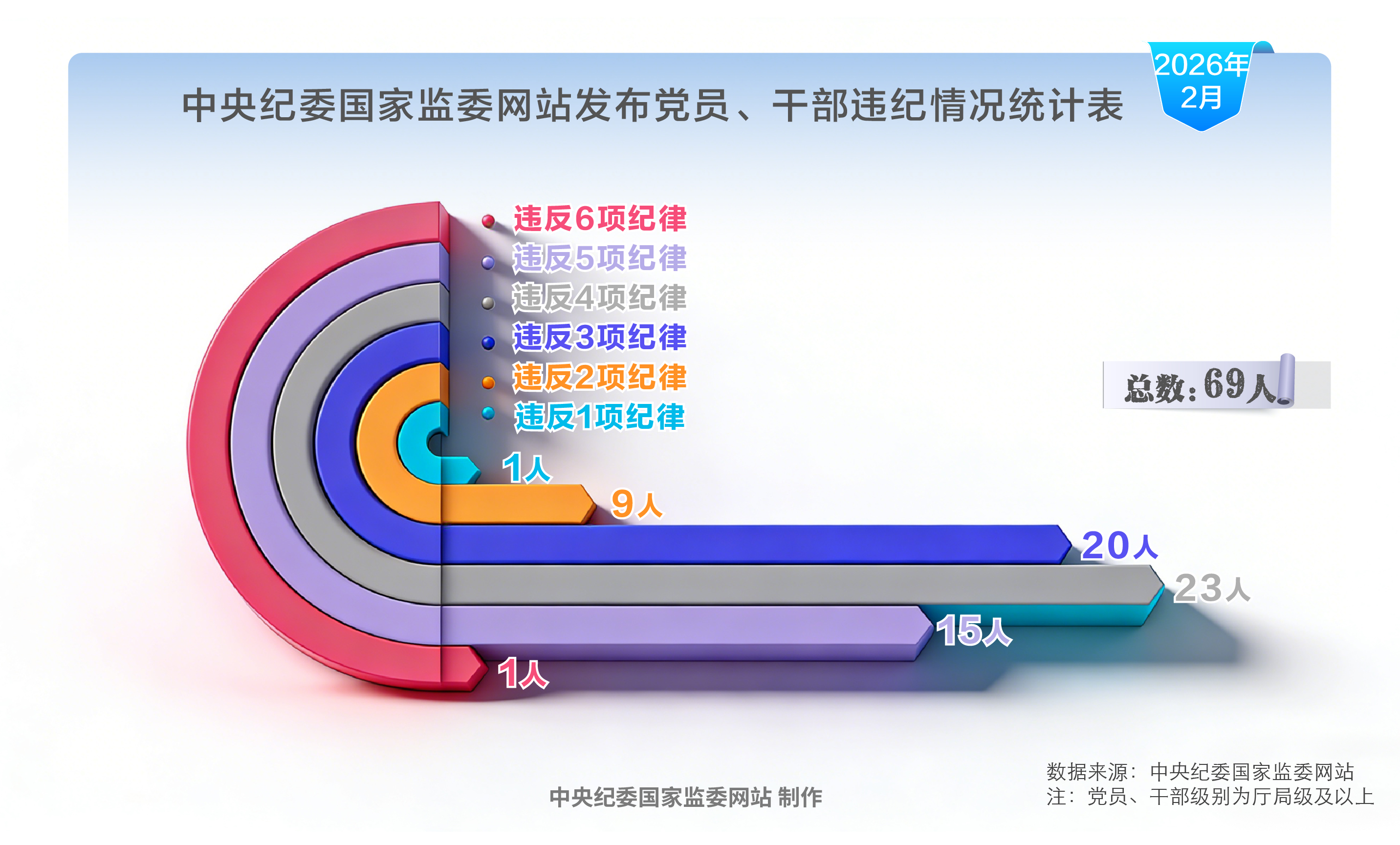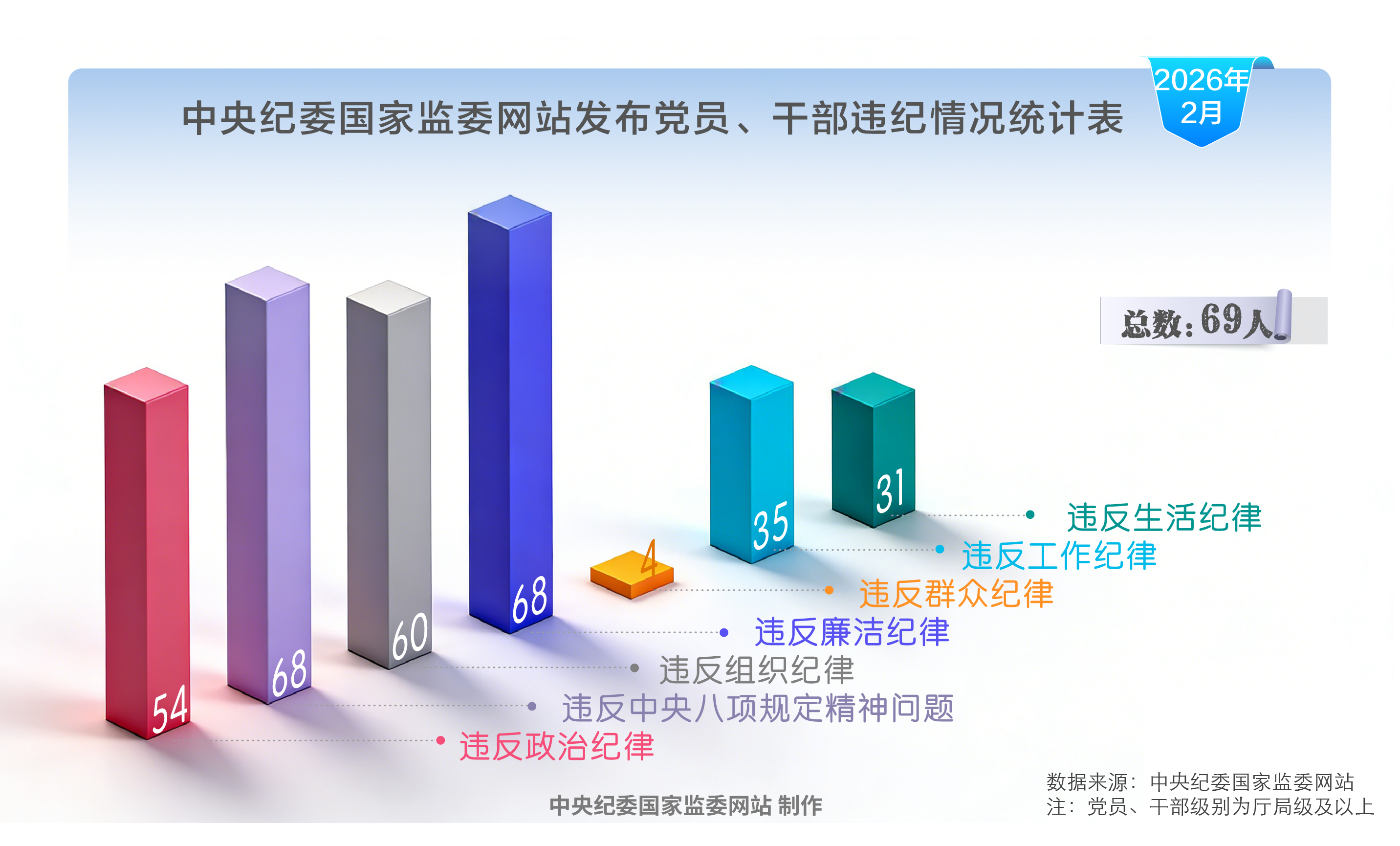 2026年2月,中央纪委国家监委网站发布69名党员、干部党纪政务处分信息,其中,54人存在违反政治纪律问题,68人违反中央八项规定精神,60人违反组织纪律,68人违反廉洁纪律,4人违反群众纪律,35人违反工作纪律,31人违反生活纪律。