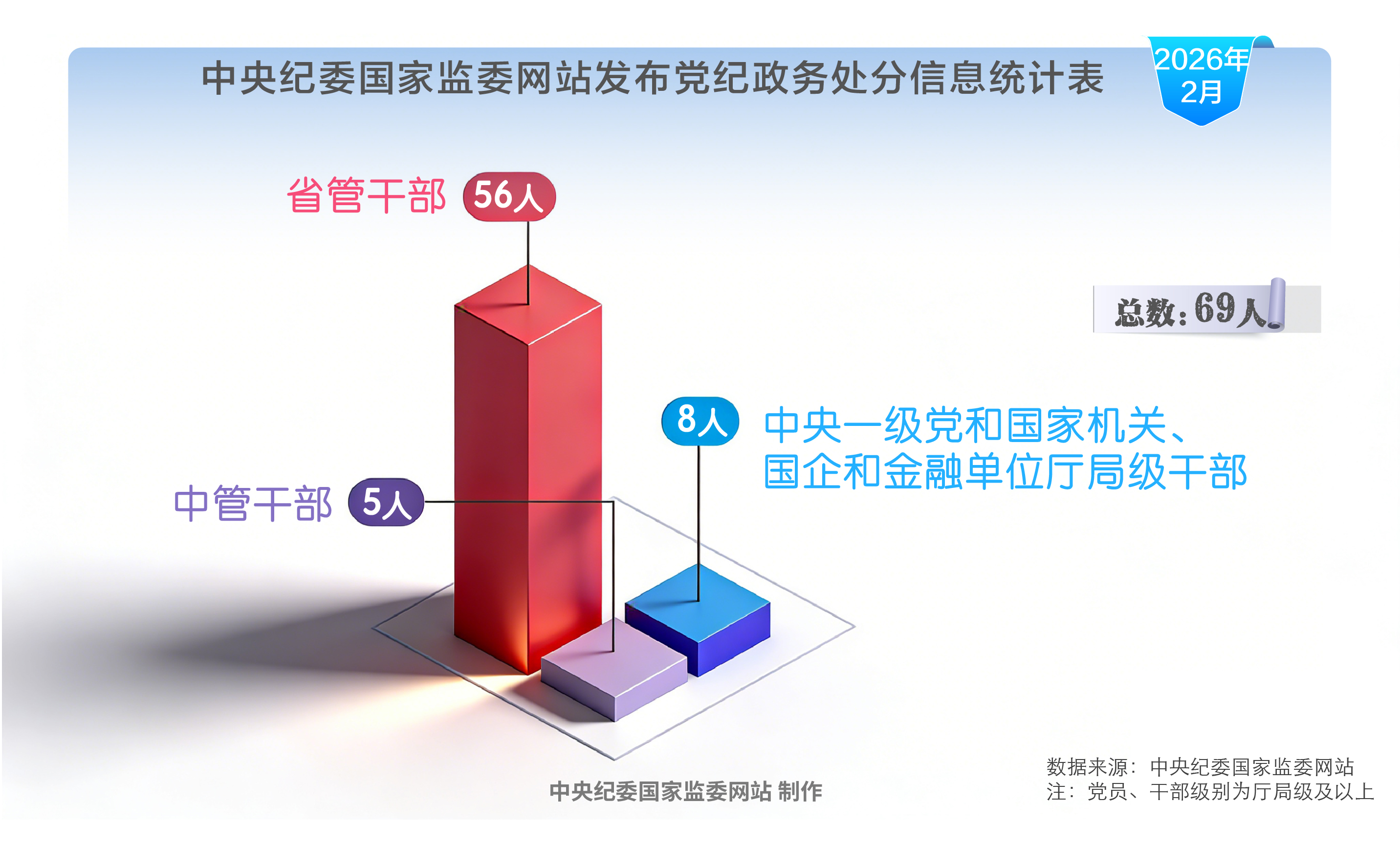 2026年2月,中央纪委国家监委网站共发布69名党员、干部党纪政务处分信息。其中,中管干部5名,中央一级党和国家机关、国企和金融单位厅局级干部8名,省管干部56名。