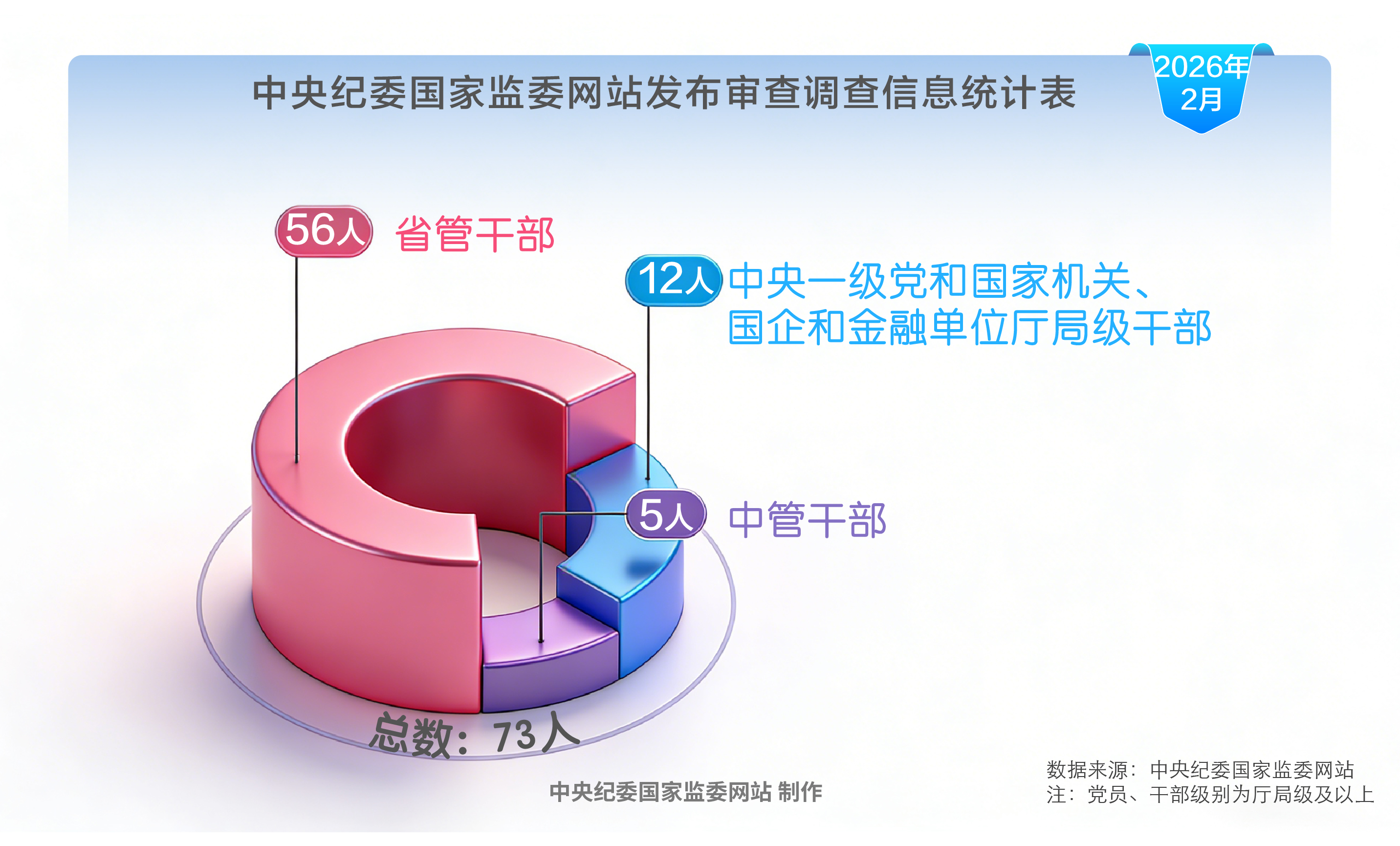 2026年2月,中央纪委国家监委网站共发布73名党员、干部接受审查调查信息。其中,中管干部5名,中央一级党和国家机关、国企和金融单位厅局级干部12名,省管干部56名。