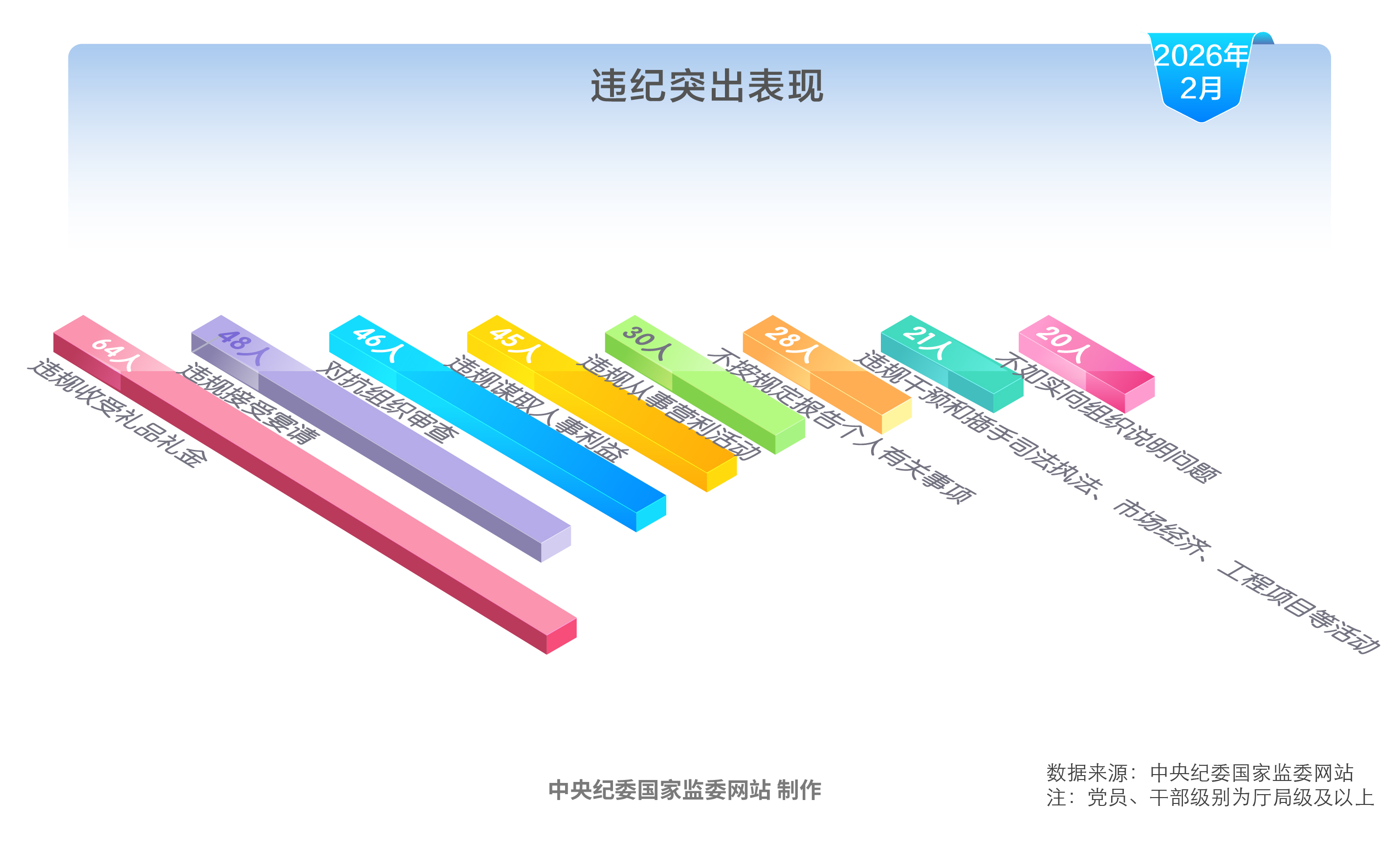 2026年2月,在中央纪委国家监委网站发布的党纪政务处分信息中,被处分党员、干部大多违反多项纪律。违反6项纪律的1人,违反5项纪律的15人,违反4项纪律的23人,违反3项纪律的20人,违反2项纪律的9人,违反1项纪律的1人。