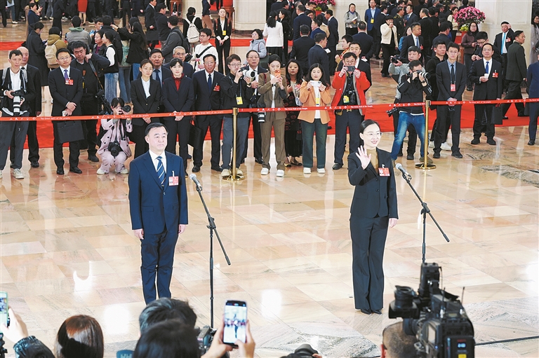 3月9日上午,十四届全国人大四次会议第二场“代表通道”集中采访活动在人民大会堂举行。图为全国人大代表顾雪(右)、周琪接受媒体采访。瞿芃 摄