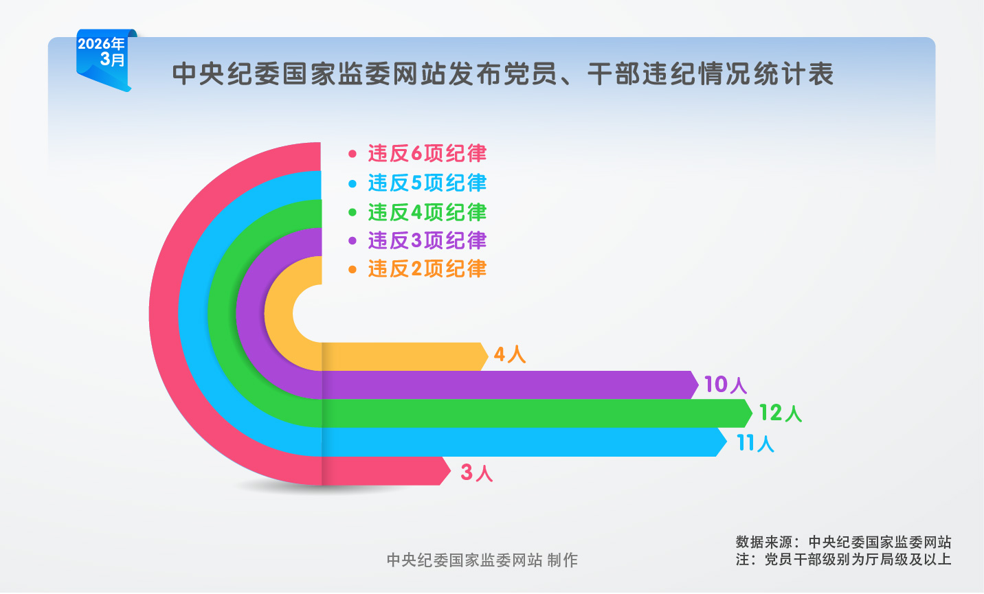 2026年3月,在中央纪委国家监委网站发布的党纪政务处分信息中,被处分党员、干部大多违反多项纪律。违反6项纪律的3人,违反5项纪律的11人,违反4项纪律的12人,违反3项纪律的10人,违反2项纪律的4人。