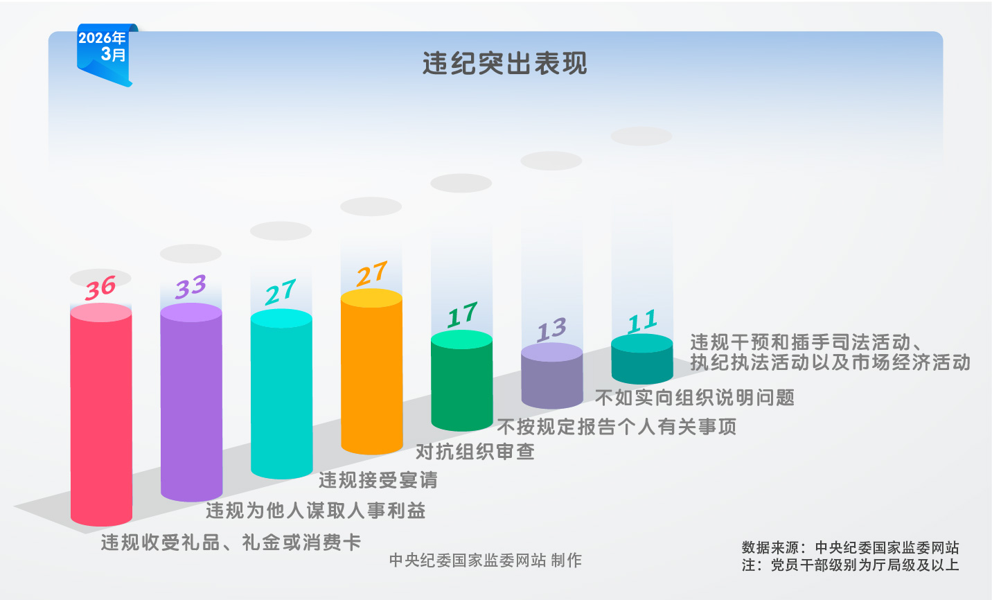 2026年3月,中央纪委国家监委网站通报的41名被处分党员领导干部中,33人违反政治纪律,34人违反中央八项规定精神,39人违反组织纪律,39人违反廉洁纪律,3人违反群众纪律,20人违反工作纪律,25人违反生活纪律。