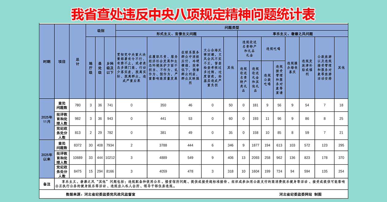 2025年11月全省查处违反中央八项规定精神问题780起